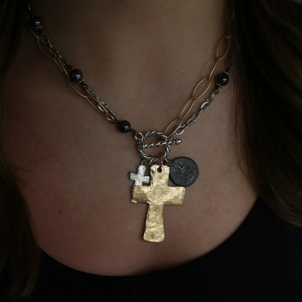 This classic ID design brings back a style that everyone was missing! Wear it long or use the bar and toggle to wear it short! Mixed metal is the theme and the elements of this design were carefully designed to look good either way you wear it! It's like getting 2 for 1!