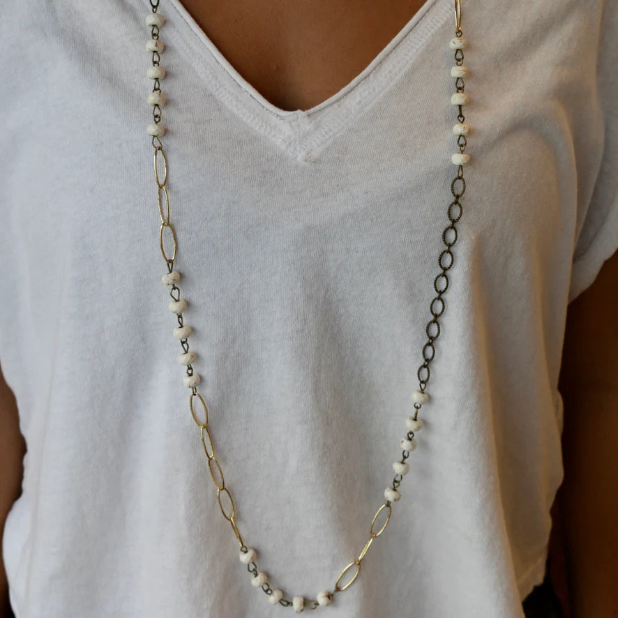 Our eternity style necklaces are a versatile option that is a must for a great layered look.  It can be worn long, mid or short.  This version has a vintage twist with white turquoise, gold and brass chain.  We are in love with this long layering necklace.