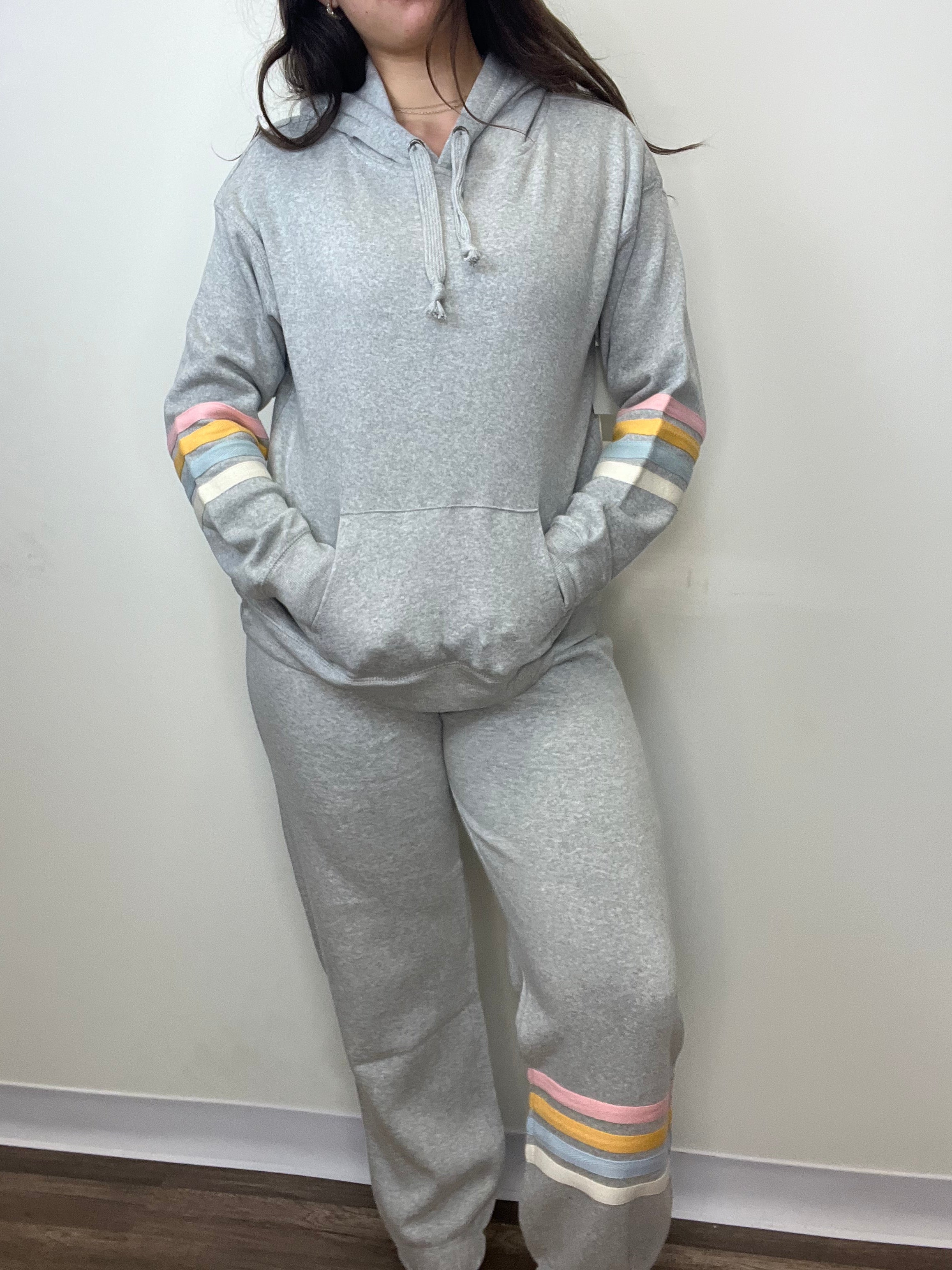 HEATHER GREY WITH SUNSET STRIPES, HEATHER FLEECE JOGGERS. WE RECOMMEND SIZING UP