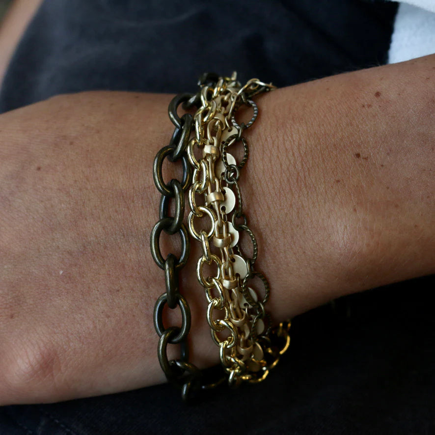 Chain Medley – GL is a bold, layered mixed-chain bracelet designed to bring texture, movement, and statement style to your everyday stack. Featuring a blend of gold and brass tones, oversized links, and varying textures, this piece is the perfect balance of edgy and timeless.