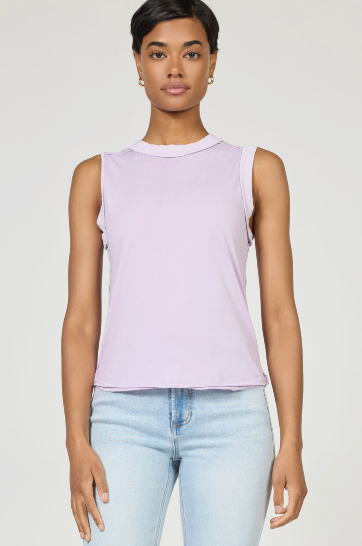 Raw edge tank, high neck finished sleeveless with banded neck & armhole, raw edge hem & center seam.