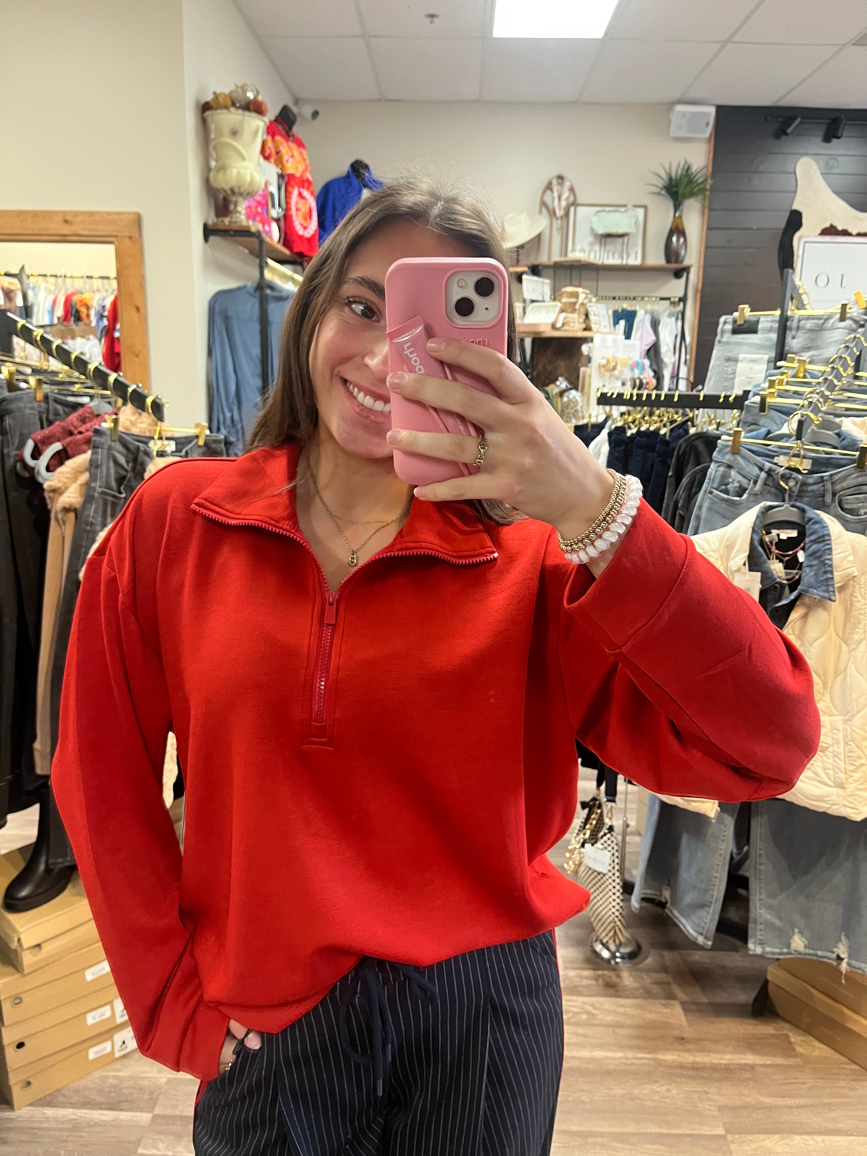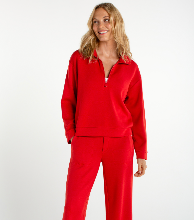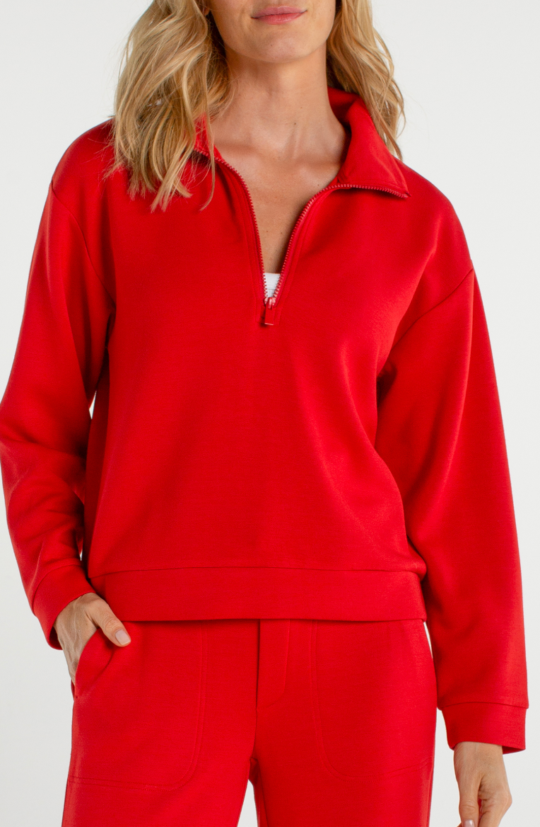 HALF ZIP POPOVER LONG SLEEVE TOP IN FIRE BRICK