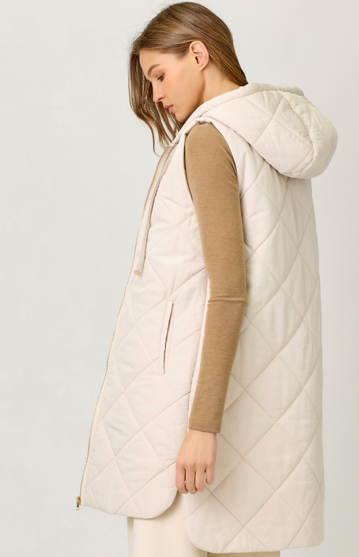Quilted Puffer Long Hoodie Vest IN IVORY