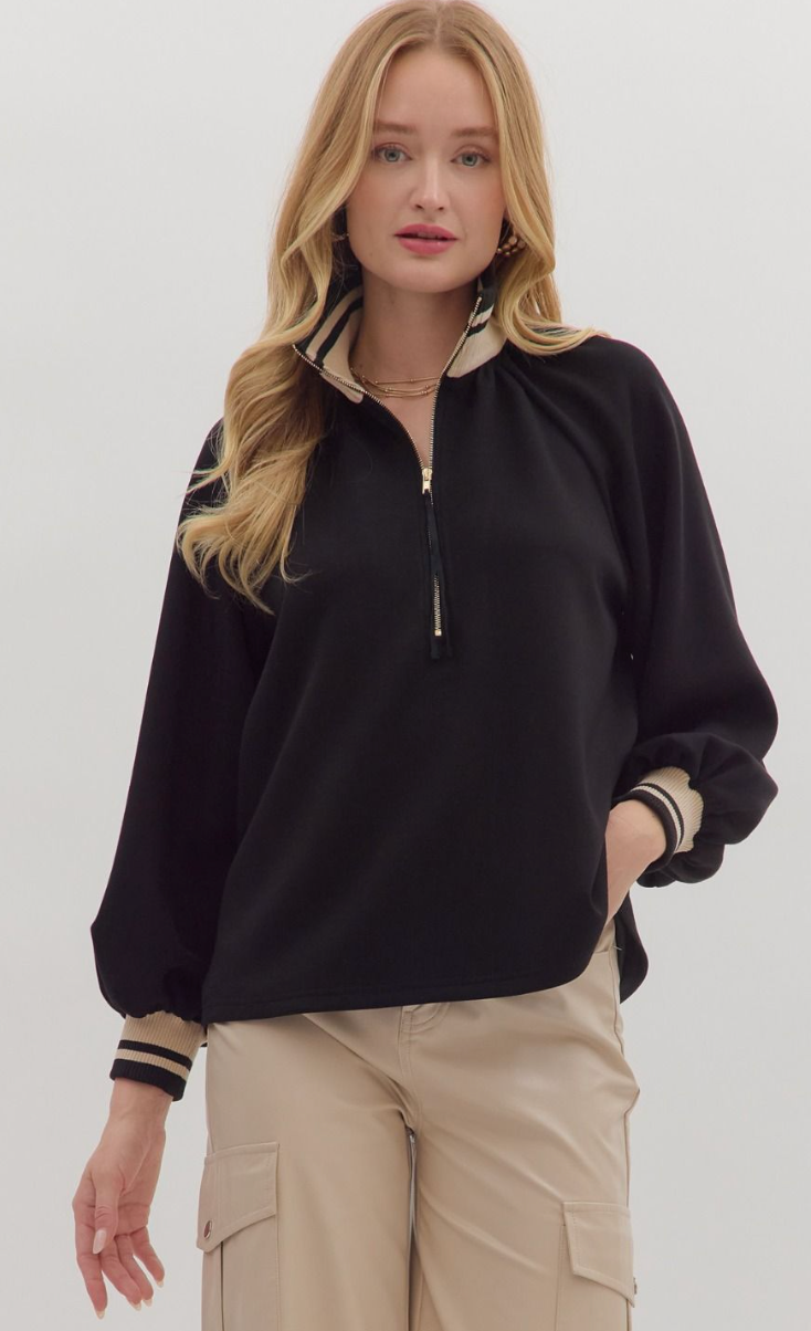 Solid long sleeve knit top featuring half zip closure at front and striped ribbed collar and cuffs. Unlined. Knit. Non-sheer. Medium weight.
