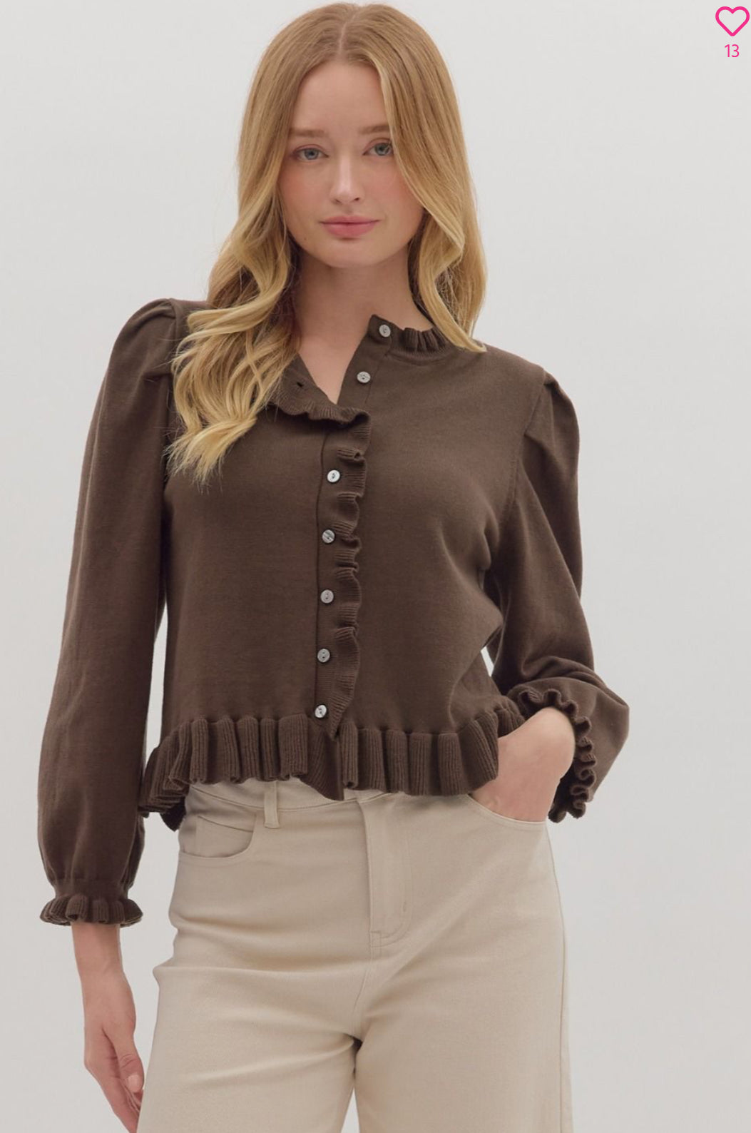 Solid long sleeve sweater knit cardigan featuring ruffled trim along front placket, neckline, hem, and cuffs. Button closure at front. Unlined. Knit. Non-sheer. Medium weight.