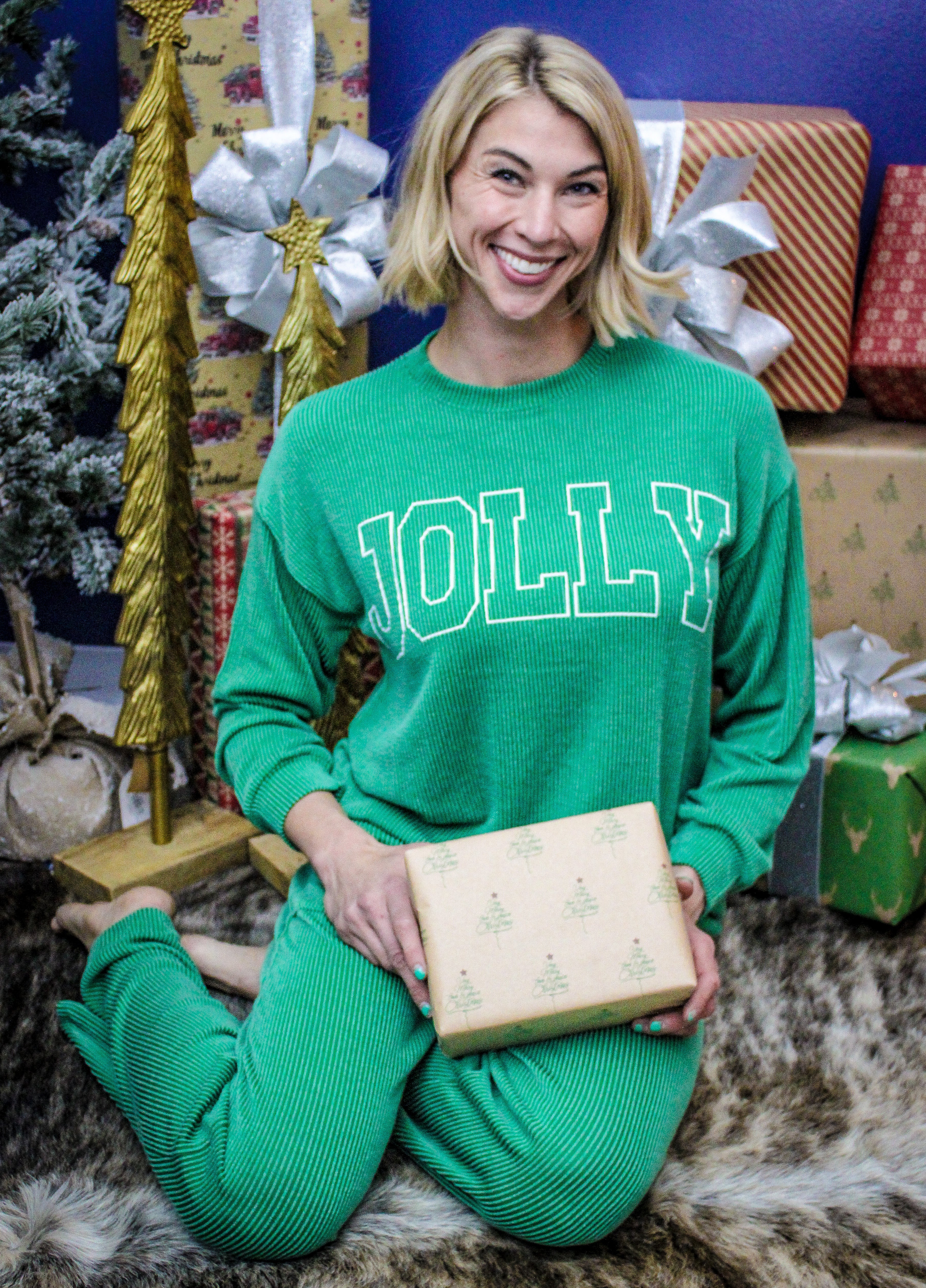 "JOLLY" RIBBED CHRISTMAS HOLIDAY ROUND NECK L/S GRAPHIC TEE & RIBBED PANTS WITH POCKETS