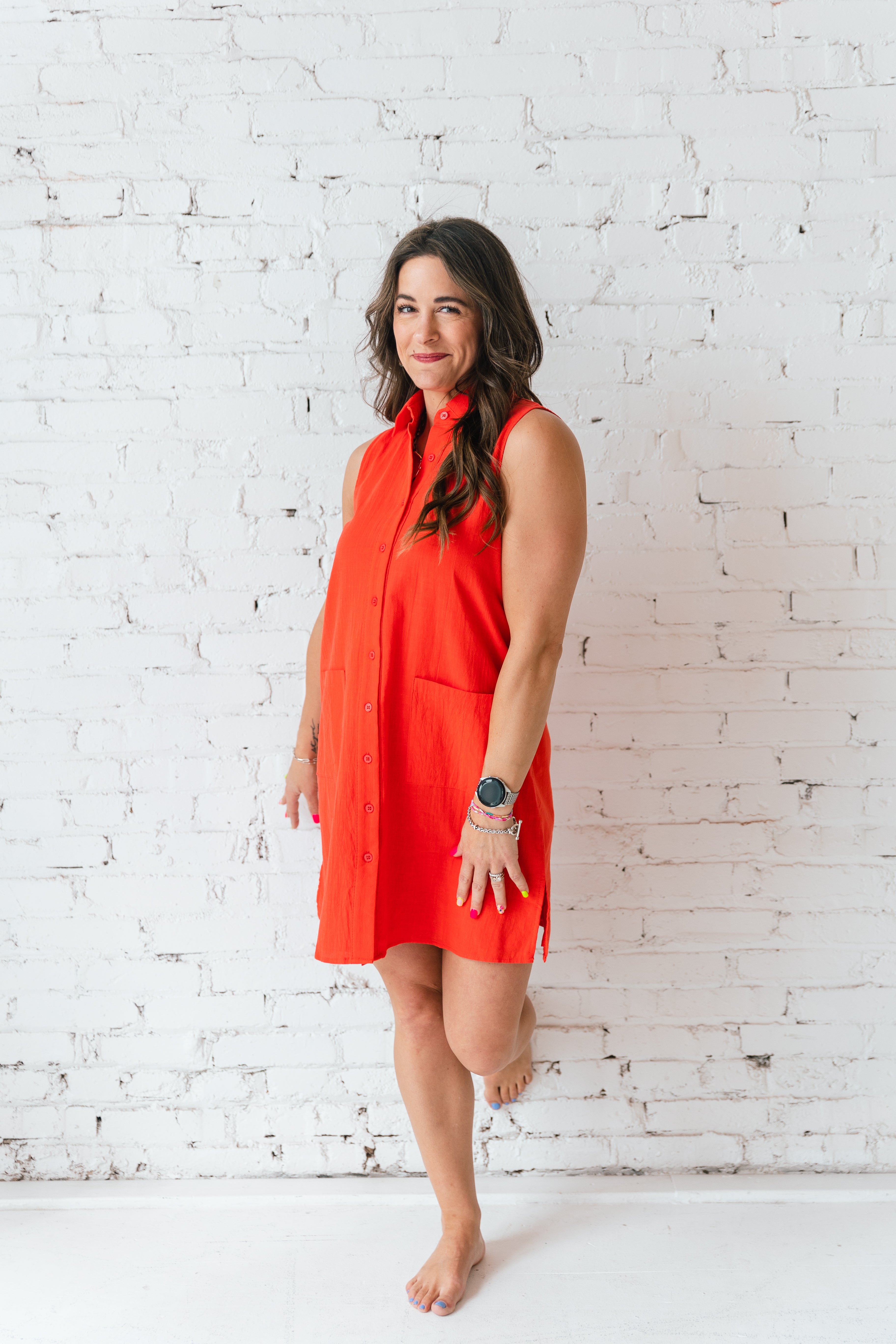 | Made from breathable, 100% cotton, this dress features a classic collared neckline, button-down front, and a relaxed sleeveless silhouette that’s perfect for warm-weather dressing. Details: - Lightweight woven cotton fabrication - Sleevless - Collared neckline - Button up shirt style - Mini (above the knee) length - Front pocket detail Style no. D30495 |