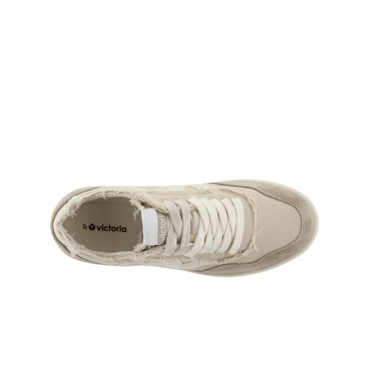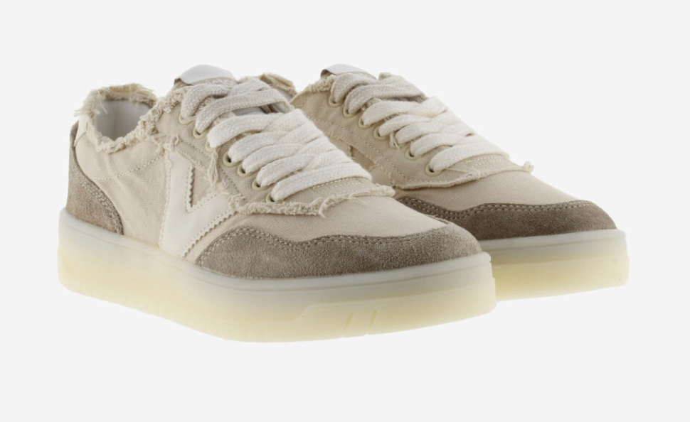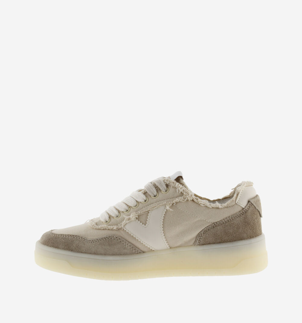 Unisex trainers made from frayed canvas with tonal suede panels. Contrasting side victoria "V" in white faux leather. Two-tone lace-up fastening with one white pair and another tonal pair. Translucent white TPR sole.